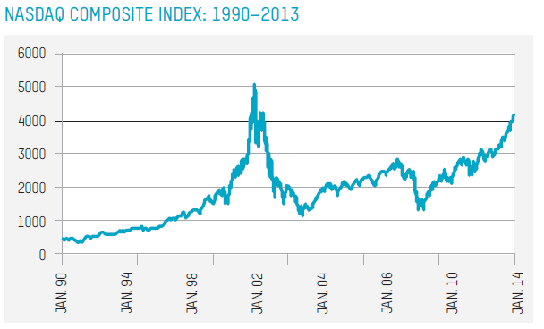 在短短的五年时间里,纳斯达克指数上涨了400%以上,这引起了全盘的疯狂。仅在1999年,高通公司的股价就疯涨了26倍。分析师们不再强调市盈率,而开始引用梅特卡夫定律。《华尔街日报》1999年的一篇文章提出了这样一个问题:利润是否只是一个“古怪的概念”,其已不再重要了?2000年1月份的超级碗赛事,更有不少于16个来自互联网公司的广告。