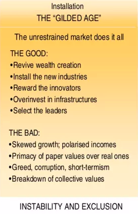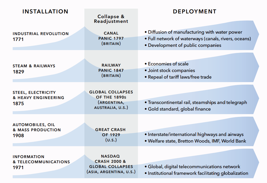安装是指一项新技术首先被探索、安装,然后被推测出来的时期。这种投机行为导致了不可持续的资产泡沫和惊人的崩溃。然后,一个更加冷静的部署阶段发生了,在此期间,技术的成熟和可持续地改变了社会的很多方面。在一个完整的部署周期耗尽了其经济增长之后,一项新技术引发了一场新的创新浪潮,而这一周期又会重新开始。