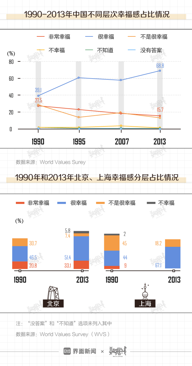 分城市来看,2013年,北京地区受访者“非常幸福”占比达33.1%,比1990年高出12.3个百分点。上海地区被调查者“很幸福”占比达67.1%,较1990年提高了23.1。