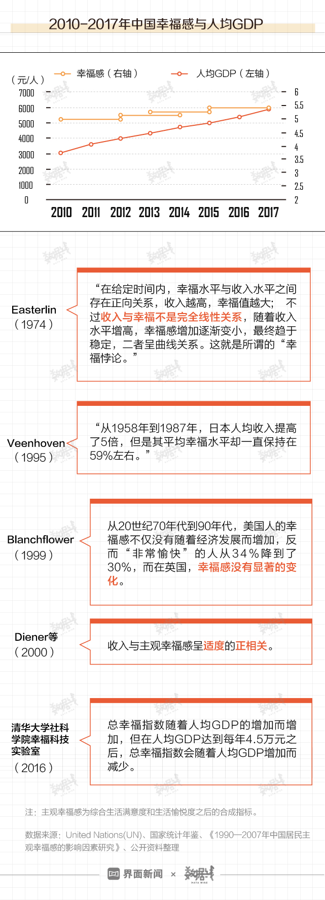 界面数据(公众号ID:shujuxian_kuaikan)整理了联合国发布的《全球幸福报告》及中国国家统计局发布的《中国统计年鉴》后发现,2010年至2017年,中国幸福指数由4.978增长至5.246,增长约5.4%,人均GDP由3.08万元/人增长至5.92万元/人,增幅达92.17%。幸福指数增长趋势同人均GDP增长趋势相一致。