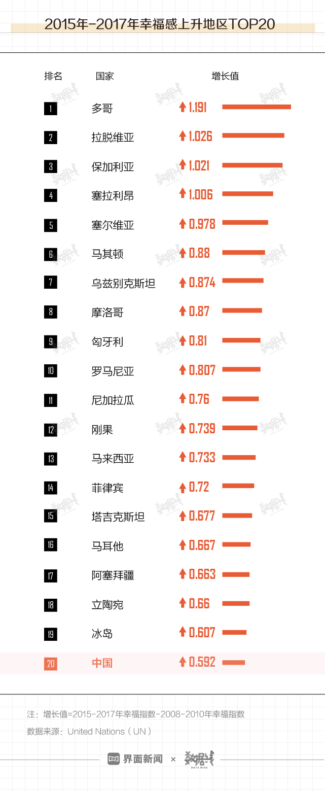 从幸福指数增长情况来看,对比2008年至2010年,2015年至2017年中国的幸福指数共计提升了0.592,中国成为幸福指数上升最快的20个国家之一。
