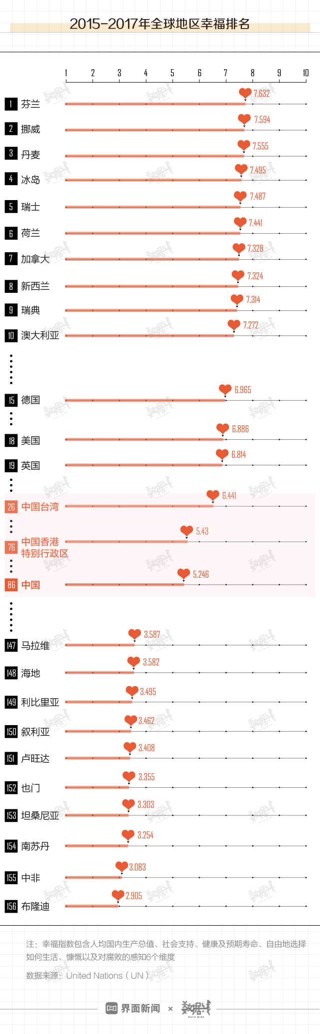 据联合国发布的《2018年世界幸福报告》,2015至2017年,在纳入统计的156个地区中,最幸福的三个地区为芬兰、挪威和丹麦,幸福指数分别为7.632、7.594和7.555。中国以5.246的幸福指数,位列全球幸福榜单第86位。