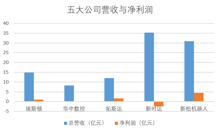 根据已经公布的数据显示,上述五家机器人上市公司中,四家实现盈利,一家亏损。其中,新时达以35.3亿元的营收和2.27亿元的亏损,成为营收最高、也是亏损最多的公司;新松机器人则凭借30.95亿元的营收和4.49亿元的净利润,成为去年机器人行业的“吸金王”。