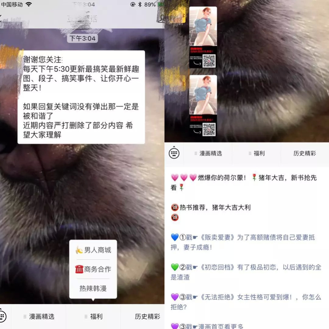 而这些业务,和公司累积的百万粉丝有着直接的关系。 “X撸漫画”,微信公众号下方的菜单栏里,选择“漫画精选-热漫地带”“福利-热漫地带”,都会收到后台自动发送的图片。图片的主要内容,是一个身材火爆的漫画女性,一个二维码,以及“未满18周岁谢绝关注”等提示字样。