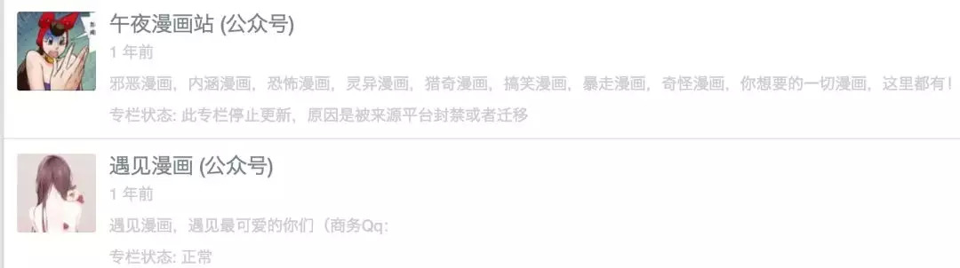 “遇见漫画”和“午夜漫画站”两个公众账号的最后更新日期,停在了一年前。