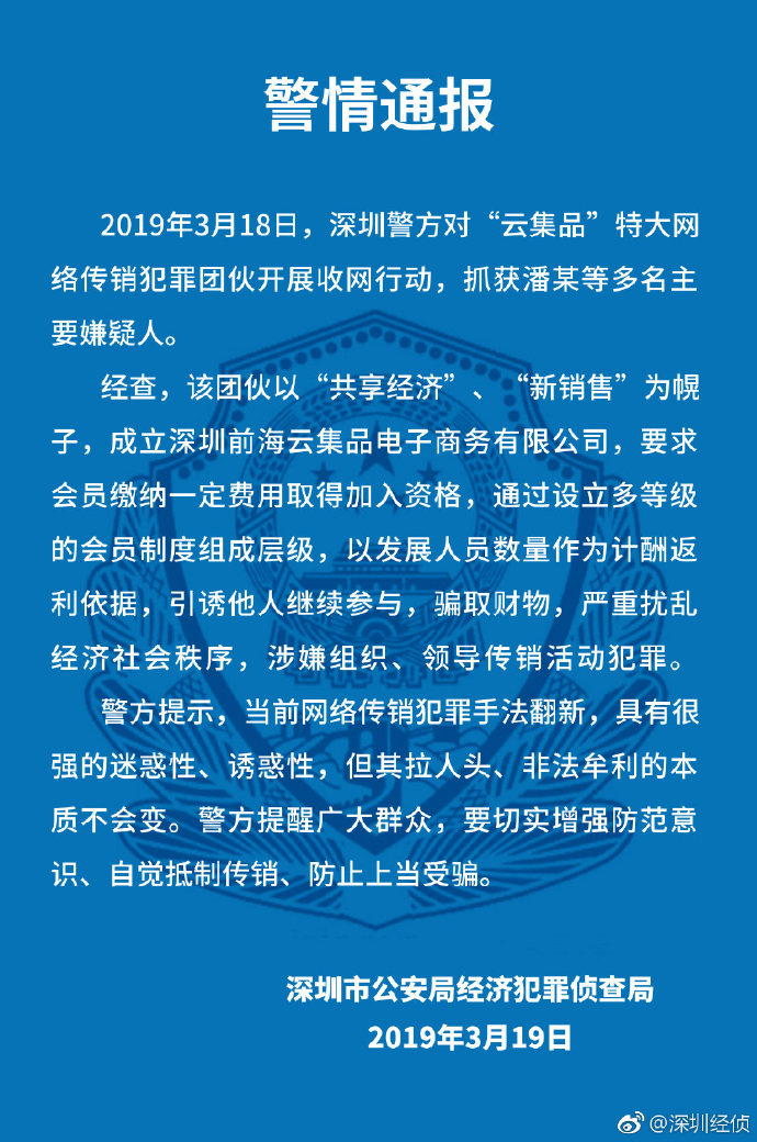 深圳市公安局经济犯罪侦查局发布警情通报,3月18日,深圳警方对“云集品”特大网络传销犯罪团伙开展收网行动,抓获潘某等多名主要嫌疑人。