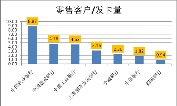 从图表不难看出,中国农业银行8.87个零售客户才会有一个人选择办理本行的信用卡。工商银行是4.62个零售客户会有一个人选择办理本行信用卡。而招商银行,则是0.94个客户就会有1张本行信用卡,这意味着,招商银行很多客户办理了不止一张本行信用卡。