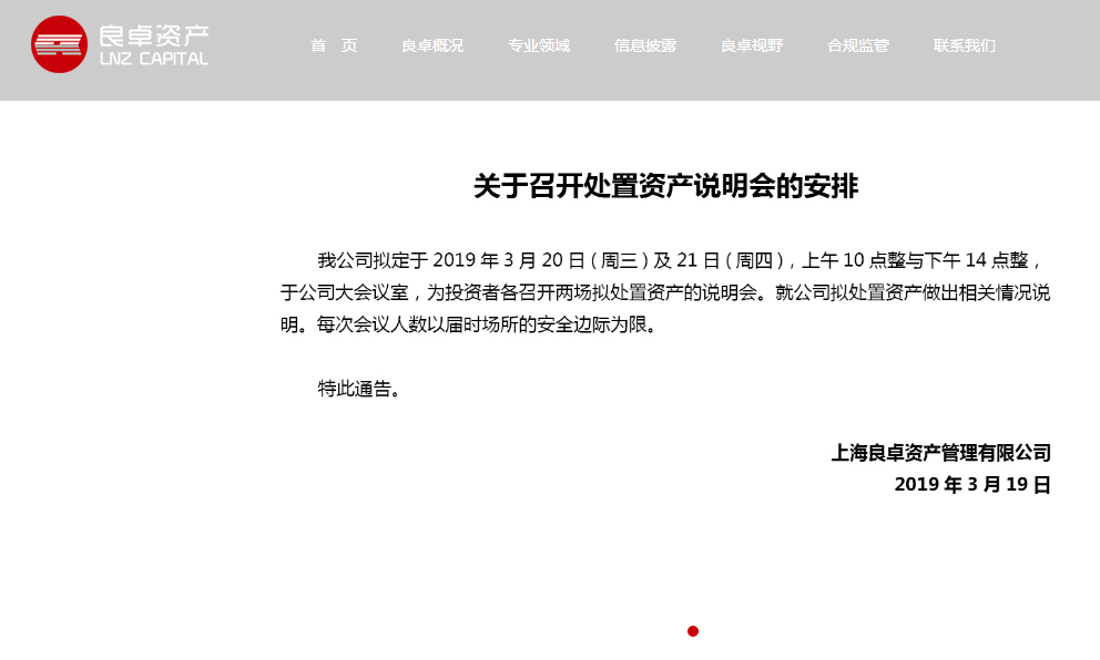 3月19日晚,良卓资产官网公告称,拟定于20日及21日为投资者开设四场处置资产的说明会,就公司拟处置资产做出相关情况说明。