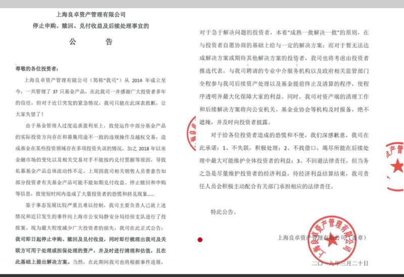 良卓资产在公告中表示,对于急于解决问题的投资者,本着“成熟一批解决一批”的原则,在与投资者自愿协商的基础上給与一定的解决方案,对于暂无法达成解决方案或期待其他解决方案的投资者,将考虑由投资者推选代表,与良卓资产聘请的专业中介服务机构以及政府相关监管部门全程参与后续资产处理以及基金提前终止及清算的程序。同时,良卓资产将对资产端的清理工作和后续解决方案将向公安机关、基金业协会等机构及时报备。