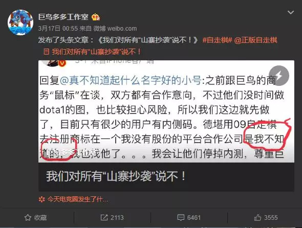事实上,要说巨鸟多多不着急,那是假的。就在3月17日凌晨,巨鸟多多工作室在微博发表的一篇长文《我们对所有“山寨抄袭”说不!》。