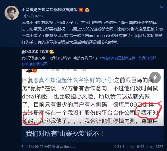 而@黄旭东也针对该长文进行留言:玩法不可能有版权,别想太多了。本身自走棋也是借鉴了战三国这种类型的玩法,如果玩法都要有版权,市面上99%的游戏都会死,比如FPS到底谁是正版?RTS还做不做了?吃鸡类型只能留一款?市面上MOBA类型还有谁?小团队只能拼创意打先手,真的能不能做强做大,最后拼的还是细节和质量。