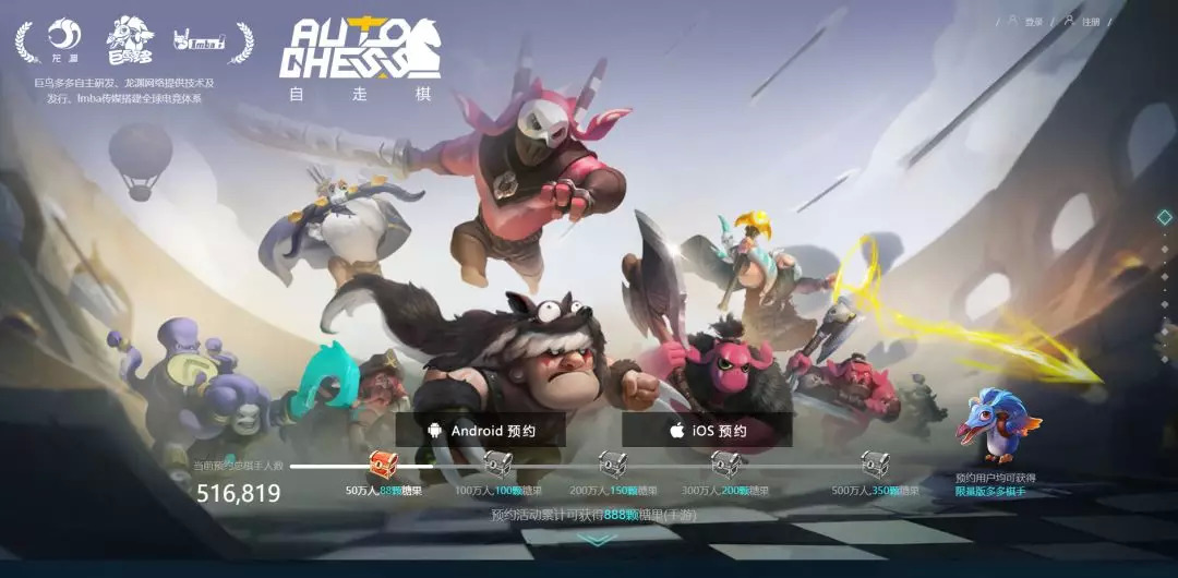 但是没有想到的是,在短短的几天之后,自走棋手游的预约页面就迅速上架,并且在官网预约的页面上清楚写道:巨鸟多多自主研发、龙渊网络提供技术及发行、imba传媒搭建全球电竞体系。