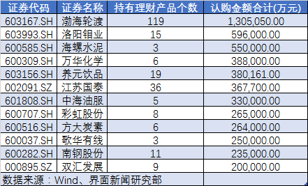 从认购金额来看,认购金额合计超过20亿元的上市公司共计12家,这其中,洛阳钼业(603993.SH)、海螺水泥(600585.SH)、万华化学(600309.SH)购买理财产品金额分别为59.60亿元、55.00亿元、38.80亿元。