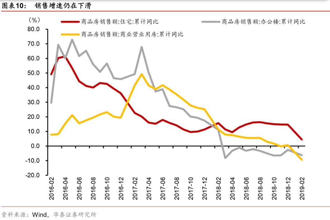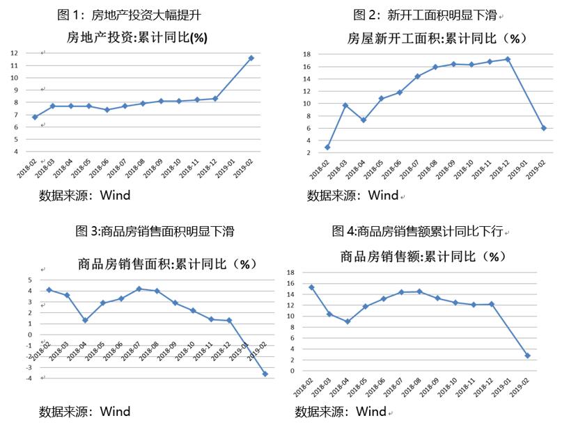 “我们预计2019年三季度房地产政策可能出现边际转向,但转向也会在坚持‘房住不炒’的大逻辑下,重点保护刚需。”华泰证券研究所李超宏观研究团队认为,2019年1-2月房地产开发投资累计同比增长11.6%,比2018年全年提高2.1个百分点。商品房销售额累计同比增速为2.8%,增速回落9.4个百分点。投资较强主要是由于施工面积增长带动,房屋施工面积累计同比增速为6.8%,比去年全年提高1.6个百分点。这与去年拉动地产投资的主要因素是土地购置费用明显不同。然而,销售、到位资金等数据不乐观,反应地产后续的下行压力较大。
