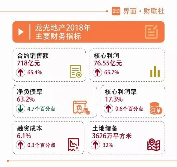 3月19日午间,龙光地产(3380.hk)发布2018年年报显示,全年实现合约销售额约718亿元,较去年增长约65.4%;合约销售面积为440万平方米,较去年增长约81.4%;全年营业收入为441.3亿元,较去年增长约59.4%;核心利润约为76.6亿元,较去年上升约65.7%,核心利润率达17.3%,盈利水准继续领先行业。