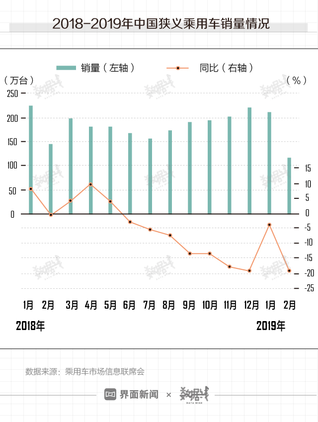 乘用车市场信息联席会数据显示,2019年2月,中国狭义乘用车销量116.98万台,同比下降19.0%。狭义乘用车销量同比增速下滑趋势(自2018年6月份以来)仍在继续。