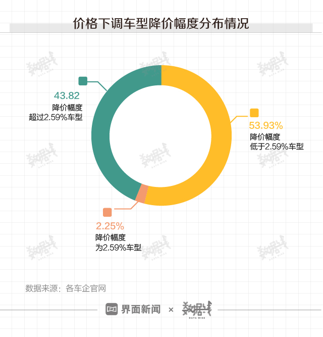 界面数据(公众号ID:shujuxian_kuaikan)进一步统计后发现,在此次下调价格的89款车型中,超5成(48款)的降价幅度低于2.59%。另有四成(39款)降价幅度高于2.59%。