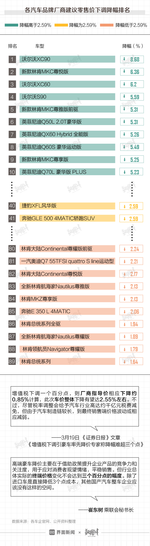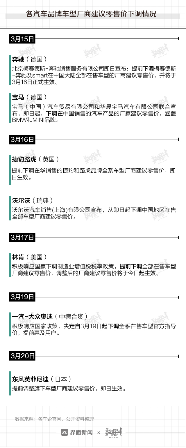 此前,为响应增值税下调政策,奔驰、宝马等7家汽车品牌已陆续下调中国地区车型厂商建议零售价,打响汽车降价战。