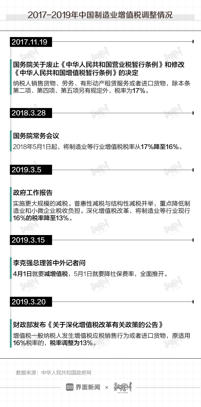 据界面数据(公众号ID:shujuxian_kuaikan)统计,2018年5月1日,制造业等行业增值税税率从17%降至16%。2019年4月1日起,制造业现行增值税税率将从16%降至13%。