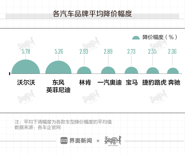 从各家品牌的平均降价幅度来看,奔驰降幅最小(2.36%),沃尔沃降幅最大(5.78%)。