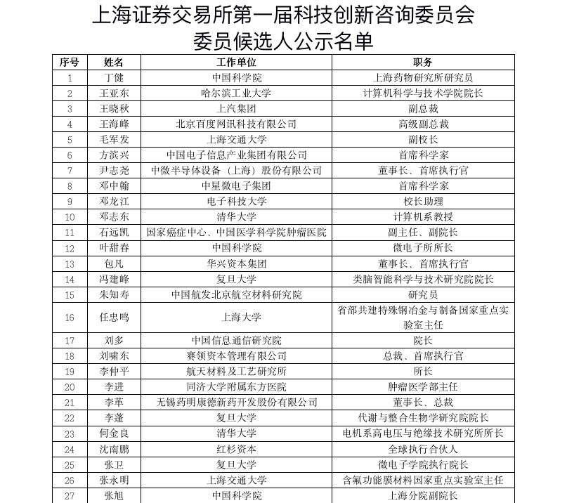 3月21日,上交所公布了第一届科技创新咨询委员会(以下简称咨询委)候选人名单。其中不乏华兴资本创始人包凡、红杉资本全球执行合伙人沈南鹏、高瓴资本创始人张磊等资本圈大佬的熟悉身影。