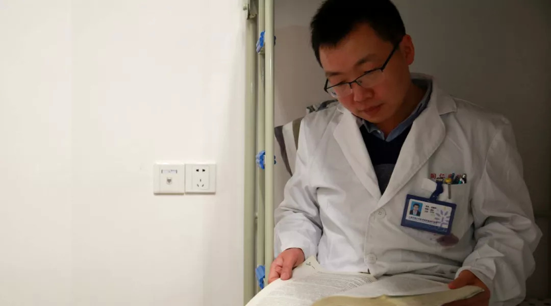 休息室里,一名值班医生半坐在床边翻看医学书籍 图片来源:实拍