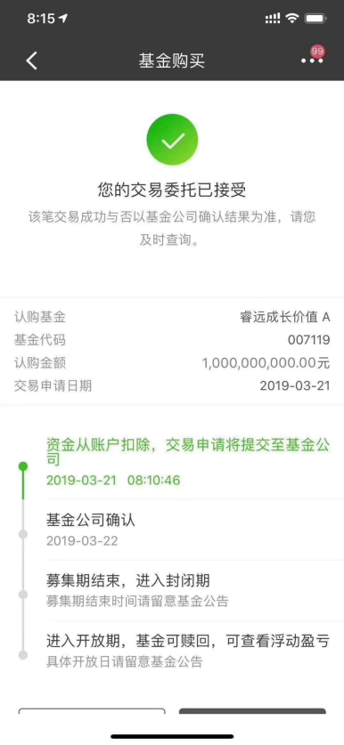 此外,也有声音质疑销售过程中存在违规。“招商银行在销售前一天(20日)就在预售了,鼓励客户把钱先打进去,然后在今天开售后统一代替客户向睿远基金发出购买指令。我觉得,这其实不大合适。”某渠道人士向界面记者表示。