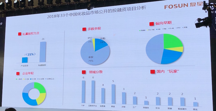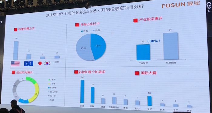 复星化妆品集团执行总裁郑涛对比了中国及海外化妆品市场2018年公开的投融资项目。他发现,中国市场上几乎都是国内玩家,产业投资比例仅为21%,大多数(79%)以参股为主,被投企业相对年轻,投资阶段大部分在B轮以前,投资领域也相对分散。而海外市场上,投融资项目也都发生在欧美日韩品牌上,并购占比过半(55%),产业投资比例较高(38%),被投企业创立时间偏长,吸引的多是欧莱雅、雅诗兰黛、联合利华等大公司或知名投资方。