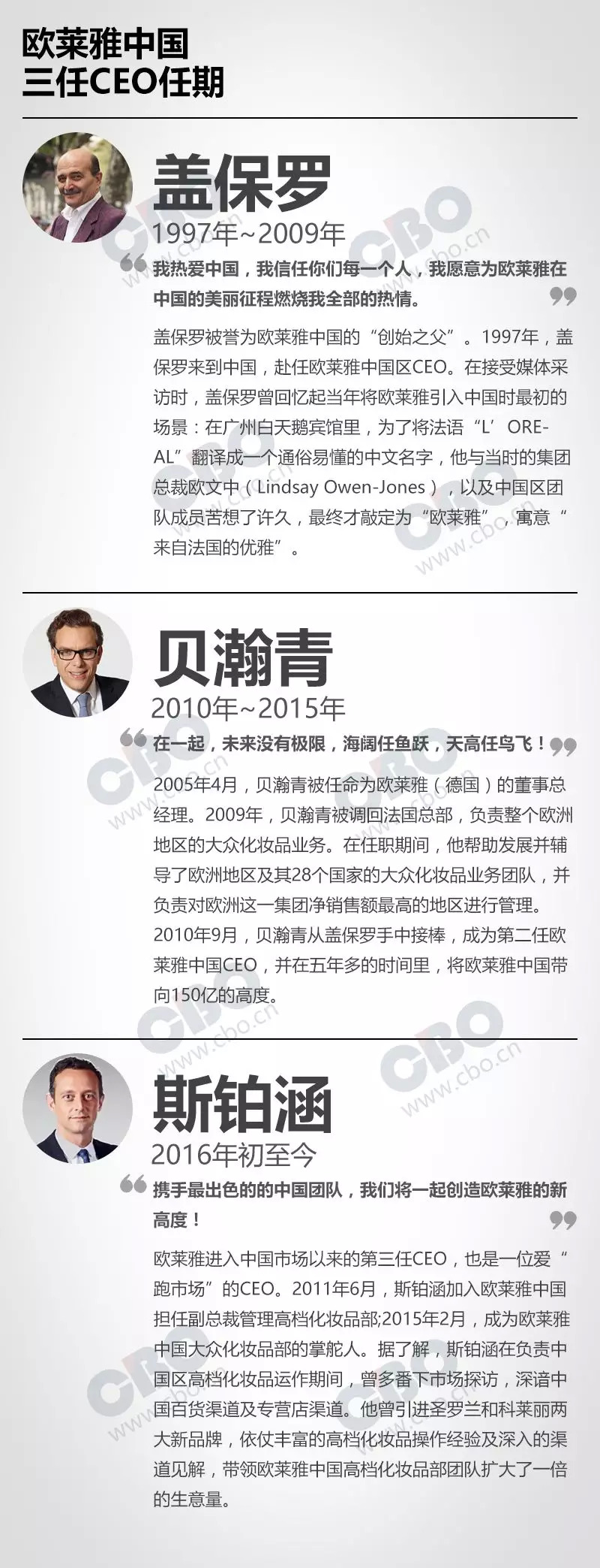 如同集团总部一样,在众多外资企业里,欧莱雅中国的掌门人也相对稳定。二十年里,欧莱雅中国先后上任了三位CEO:盖保罗、贝瀚青以及斯铂涵。