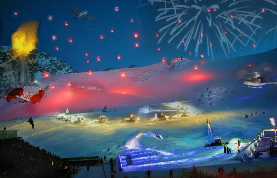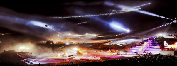 从舞台向几百米开外的雪山冰川延伸,185度,大约800个足球场大小的6平方千米的舞台中,拔地而起的立体装置,空中飞过的直升机、空中降落的滑翔伞、雪地上的滑雪者,雪中飞驰的雪地车部队、以及冰雕而成的大象,上百名滑雪教练演绎出列阵的非洲部落。汉尼拔将军站在移动的金字塔上,仿佛回到恢宏的战场,用绚烂的灯光指引着军队。这,是任何舞台和荧幕都无法给你的视觉冲击。