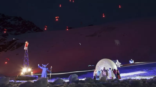 夜幕降临,地平线上的余辉勾勒出250多座3000米高的山峰。这就是由大自然搭建的世界上最大的雪山舞台。雪山舞台的中间,有一块巨大荧幕,旁边有一座10米高的金字塔,当观众们兴奋的呐喊在山间回荡,伴随着直升机的轰鸣声,演出便拉开帷幕。