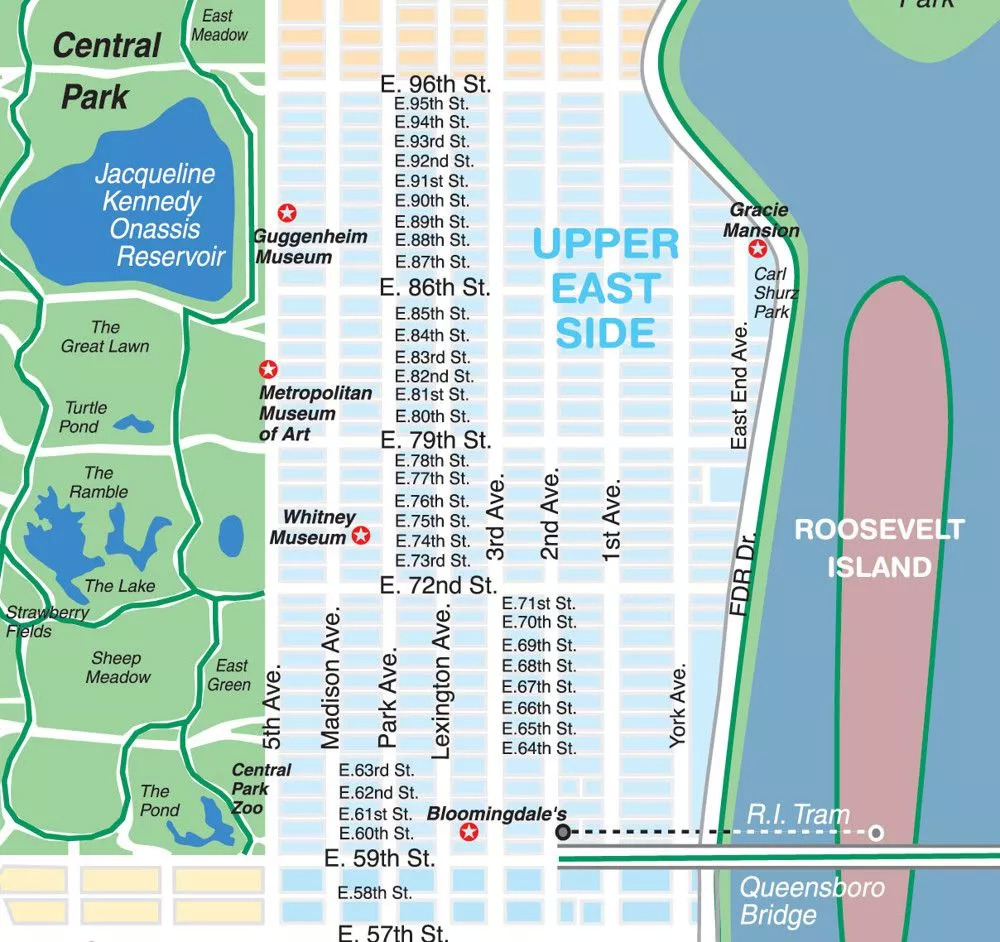 上东区在纽约的地理概念是南起第59街,北至第96街,西至第五大道,东至依斯特河。