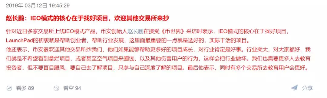 3月12日,币安创始人赵长鹏在接受某媒体采访时放言:“IEO模式的核心在于找好项目...很欢迎其他交易所来抄”。不难看出,赵长鹏对币安LaunchPad重启IEO可谓信心满满。果不其然,随后IEO(全称Initial Exchange Offering,即首次交易所上架发行)名声大噪,其他交易所都蓄势待发,纷纷准备与币安Launchpad分一杯羹。然而联合创始人何一却跳出来不断“拆台”,极力澄清IEO和币安的关联。