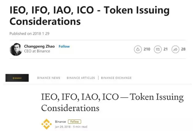 笔者检索关于IEO的文章,最早源于领英Changpeng Zhao和binance exchange于2018年1月29日发布的《IEO、IFO、IAO、ICO——Token发行注意事项》。