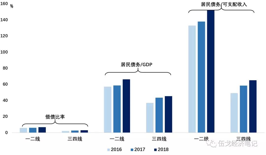 2. 虽然不少人担心前期棚改货币化可能透支了三四线城市的需求,但各种测算都表明,当前三四线居民的债务压力其实仍远低于一二线。