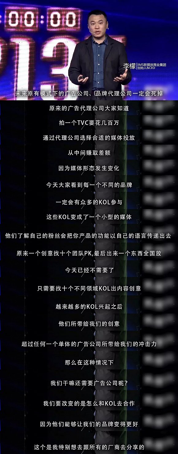 最近一番言论在广告圈引来了不小的争议,IMS新媒体商业集团的CEO李檬在一次行业大会上声称,在未来,靠制作TVC(电视广告)、平面广告、找代理公司做媒介投放并从中赚取差价的广告公司,一定会被KOL(“关键意见领袖”,包含但不限于网红)所取代。