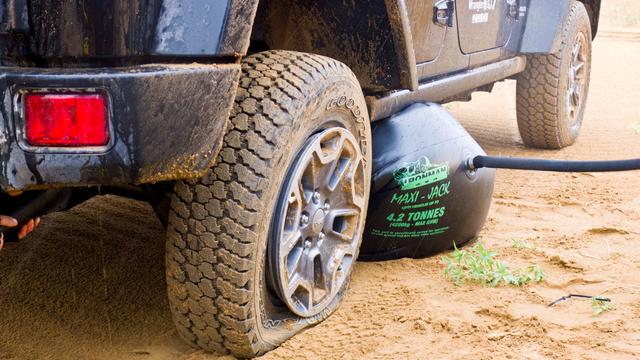 这一点沙漠玩家一定要注意,在选择千斤顶产品时尽量不要选择充气式千斤顶。由于沙漠中极易出现挂侧坡的状况,而使用充气千斤顶后很可能无法掌握车辆倾斜方向导致翻车,如果长期混迹于沙漠中还是踏实选购液压千斤顶或是后爬杆才是上策。