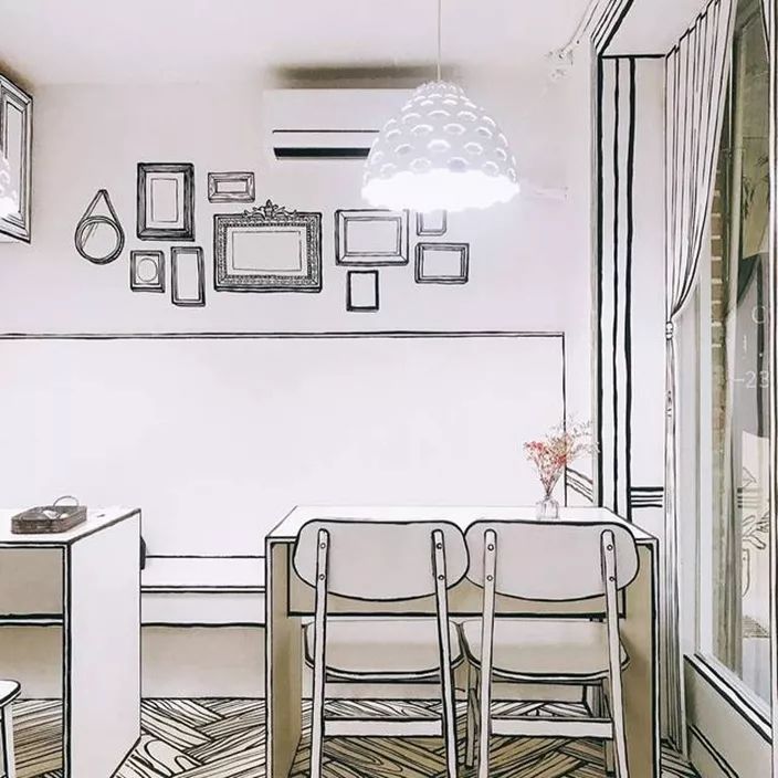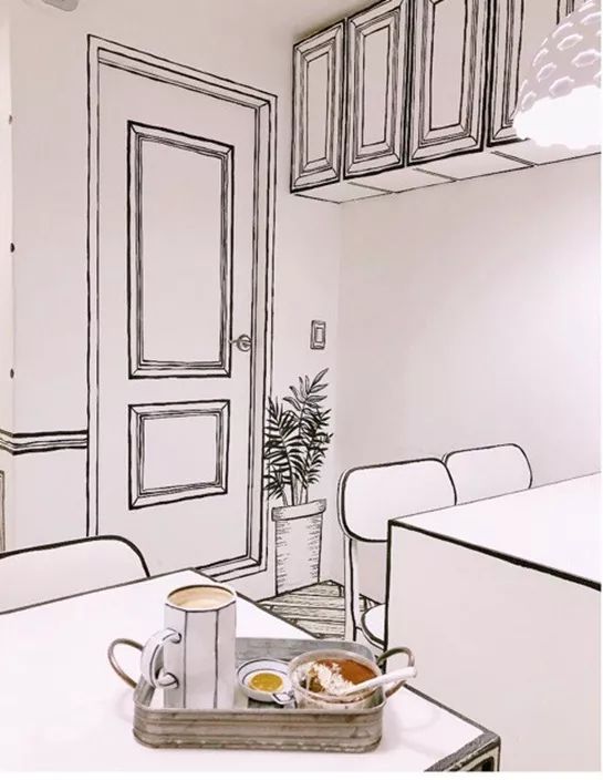 空间以白色为背景搭配黑线,从地板到天花板、墙壁到家具窗帘,甚至是咖啡杯、餐具的小物件,店家都刻意以漫画线条,勾勒出每一个边边角角。