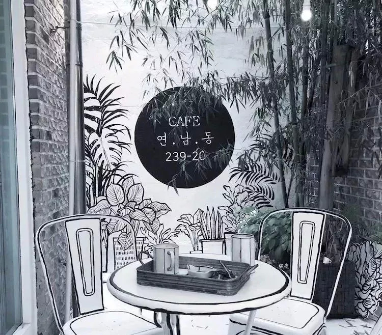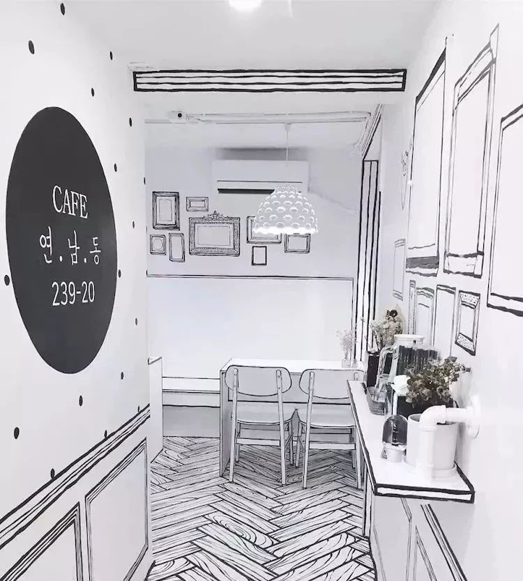 韩国新开业的某间咖啡馆,以某热门韩剧为灵感,大玩2D黑白漫画设计。走进咖啡馆,就仿佛步入奇幻的漫画世界,再现真实世界和漫画幻想的冲突。这样特别的创意设计,让这间cafe很快成为INS上的大热门。