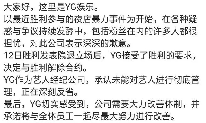 YG与胜利解约中文翻译