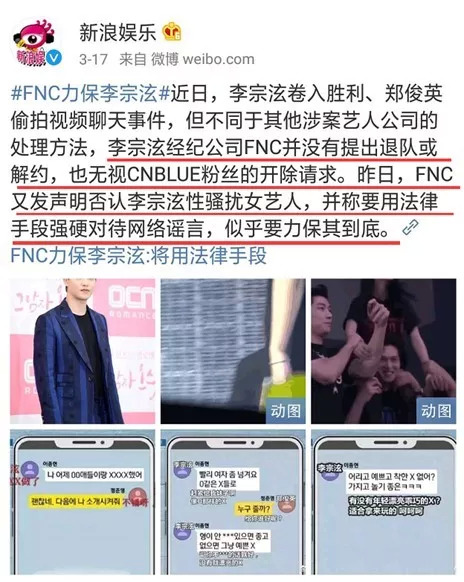 与YG最初的“护短”相比,FNC的行为更令韩国民众不满。此次介入到郑俊英聊天群的李宗泫与崔钟勋分别隶属FNC旗下男团CNBLUE和FTISLAND,在李宗泫、崔钟勋被郑俊英的聊天群牵连时,FNC对外表示,“只是互相联络的关系,明确表示和本次事件无关”,并表示未与李宗泫、崔钟勋两人有解约意向,极力否认李宗泫性骚扰女艺人,还宣称要用法律手段强硬对待网络谣言。