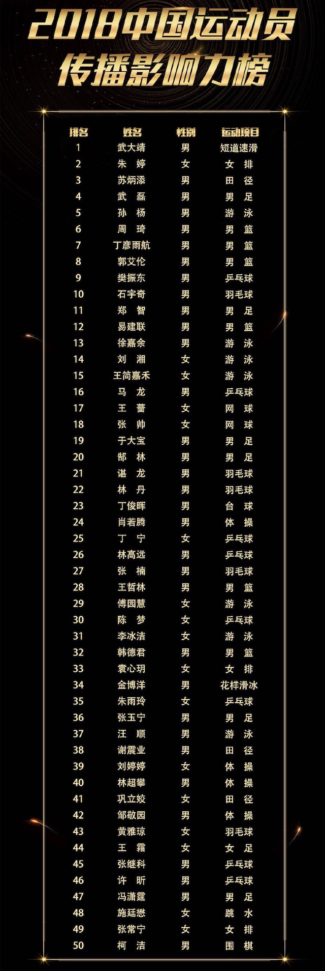 武大靖位列榜首。2018年,他三破短道速滑男子500米世界纪录,夺得中国代表团在平昌冬奥会的唯一一枚金牌,实现中国冰上男子单人项目冬奥会金牌零的突破。朱婷位列第二位,去年她带领中国队重夺亚运会女排冠军,并在世界女排锦标赛中摘取铜牌,还随瓦基弗银行队夺得土耳其女排联赛冠军,帮助球队在欧洲女排冠军联赛和世俱杯实现卫冕。她也是前十名中唯一的女运动员。
