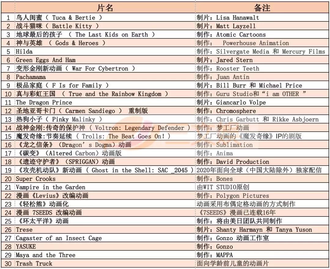 先来看看已知的30部动画内容和制作公司。