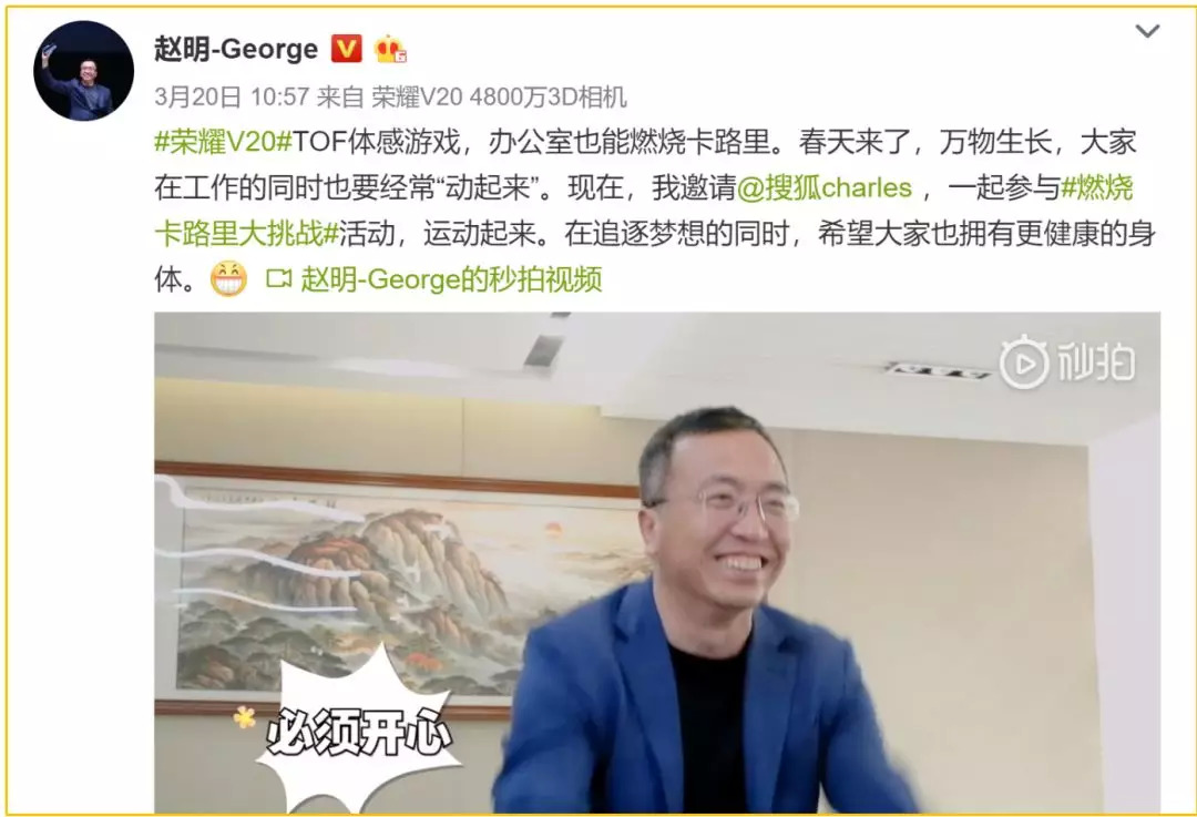 荣耀总裁赵明倡导在办公室里燃烧卡路里,做TOF体感游戏,并邀请搜狐张朝阳等业内知名人士一起健身。紧随其后,赵明又飞到俄罗斯,顺便根据GfK报告数据宣布,荣耀在今年1月份俄罗斯手机市场份额第一。