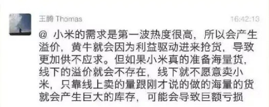 小米公关证实,该微信群中王腾的发言是真实的。可以看出,小米的一贯操作模式是,以高热度产生溢价,让看到利益的黄牛进来抢货,形成供不应求。为了不产生巨大库存和保持线下溢价,小米选择不备货太多。