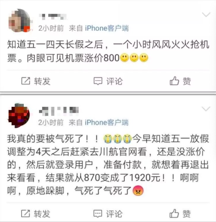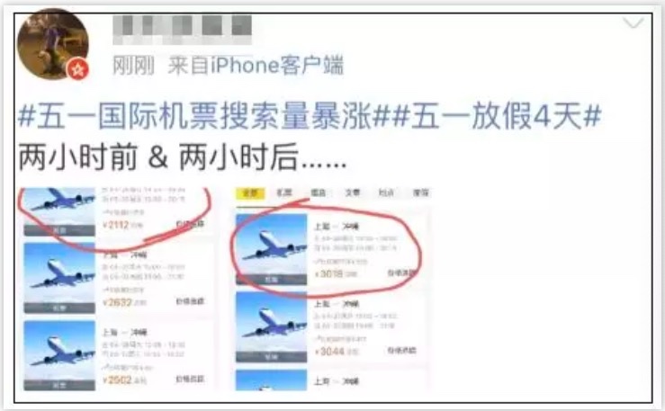 一位网友查询大连到香港的航班,2小时内涨了1500+……