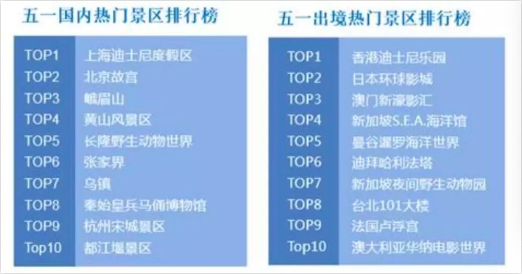 携程旅游发布《2018" 五一" 小长假旅游大数据报告》,根据携程门票的数据,2018年预订量最高的国内10 大收费景区有上海迪士尼度假区、北京故宫、峨眉山、黄山风景区等,出境的有香港迪士尼乐园、日本环球影城、澳门新濠影汇等风景区。