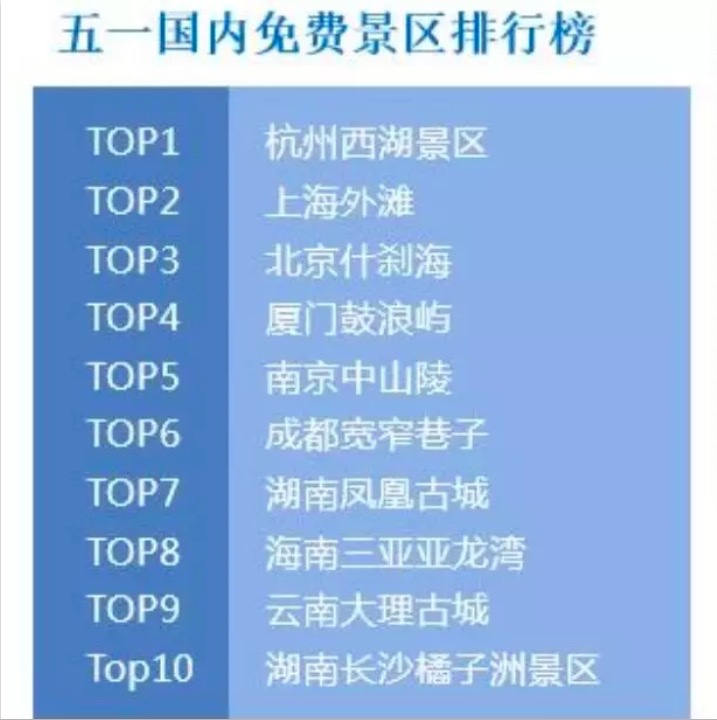 国内一些著名的5A景区、世界遗产等,部分不收门票对公众免费开放。根据景区在线搜索人气、相关度假线路预订情况,携程旅游发布了“五一国内十大人气免费景区”:浙江杭州西湖、上海外滩、北京什刹海、厦门鼓浪屿、南京中山陵、成都宽窄巷子、湖南凤凰古城、海南三亚亚龙湾、云南大理古城、湖南长沙橘子洲景区,其中,杭州西湖以绝对优势排名第一。