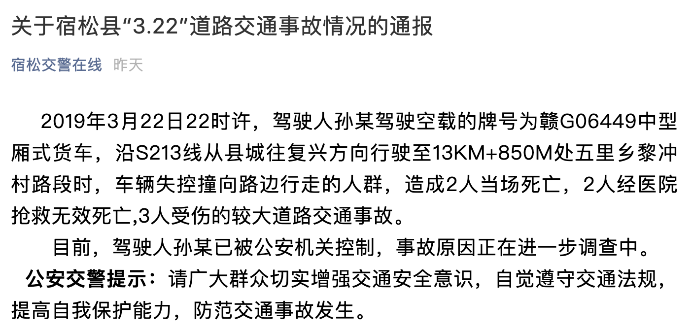 安徽省宿松县公安局交通管理大队微信公众号消息,2019年3月22日22时许,驾驶人孙某驾驶空载的牌号为赣G06449中型厢式货车,沿S213线从县城往复兴方向行驶至13KM+850M处五里乡黎冲村路段时,车辆失控撞向路边行走的人群,造成2人当场死亡,2人经医院抢救无效死亡,3人受伤的较大道路交通事故。