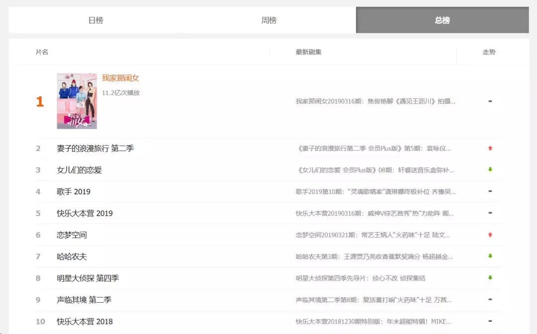 2019年初,明星观察类节目势头更加强劲。截止3月23日,在“综艺大户”芒果TV的综艺播放量排行榜中,前三席均被观察类综艺攻占。《我家那闺女》的播放量已经突破了11.2亿次。